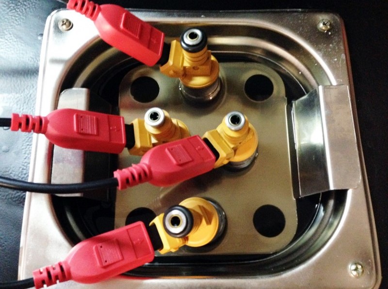 Après la phase de test, les injecteurs sont immergés dans le bac ultrasonique contenant une solution spéciale pour le nettoyage en profondeur des injecteurs. Lors du processus de nettoyage, les injecteurs qui sont connectés à des câbles, reçoivent des impulsions électriques (ouverture/fermeture) qui simulent le fonctionnement d’une voiture.